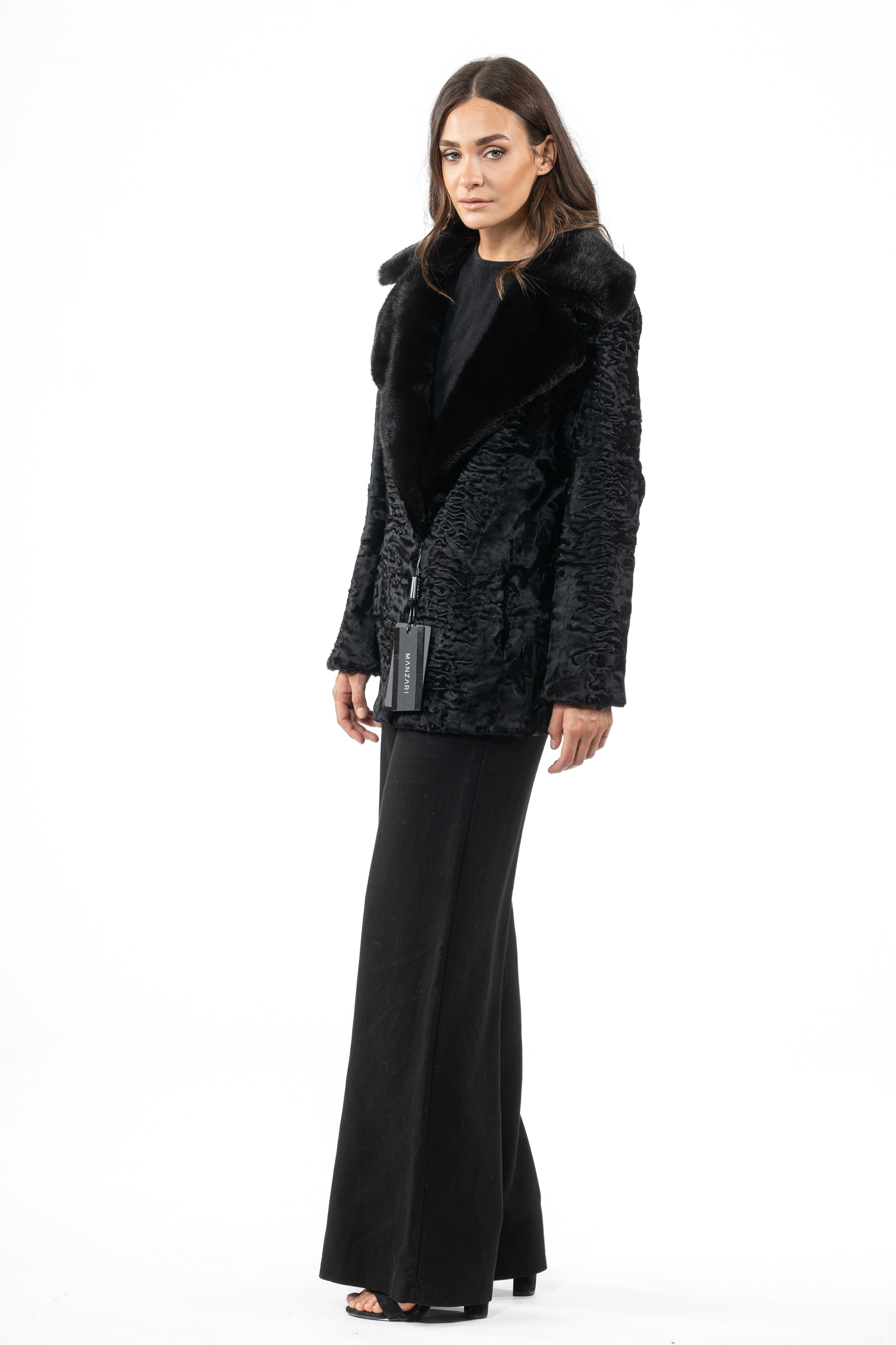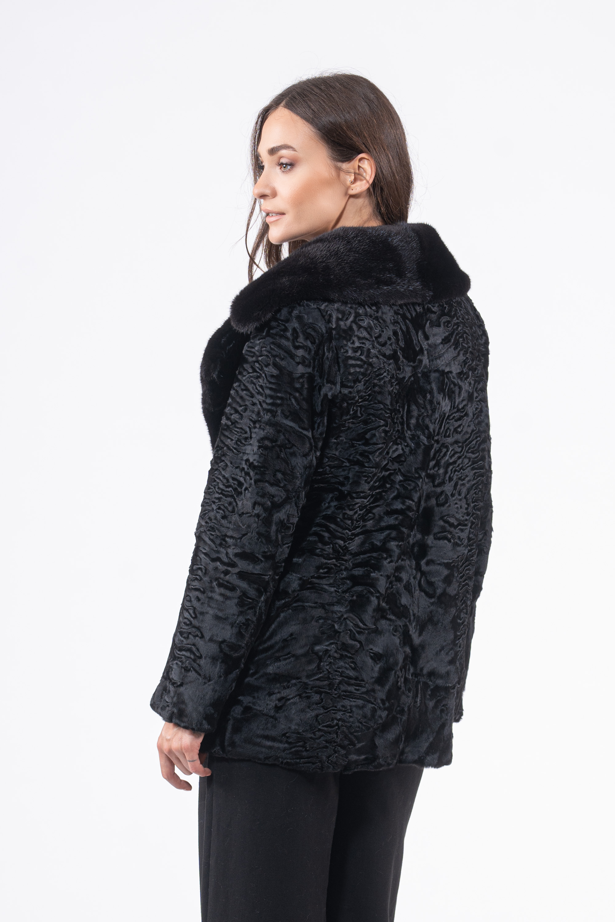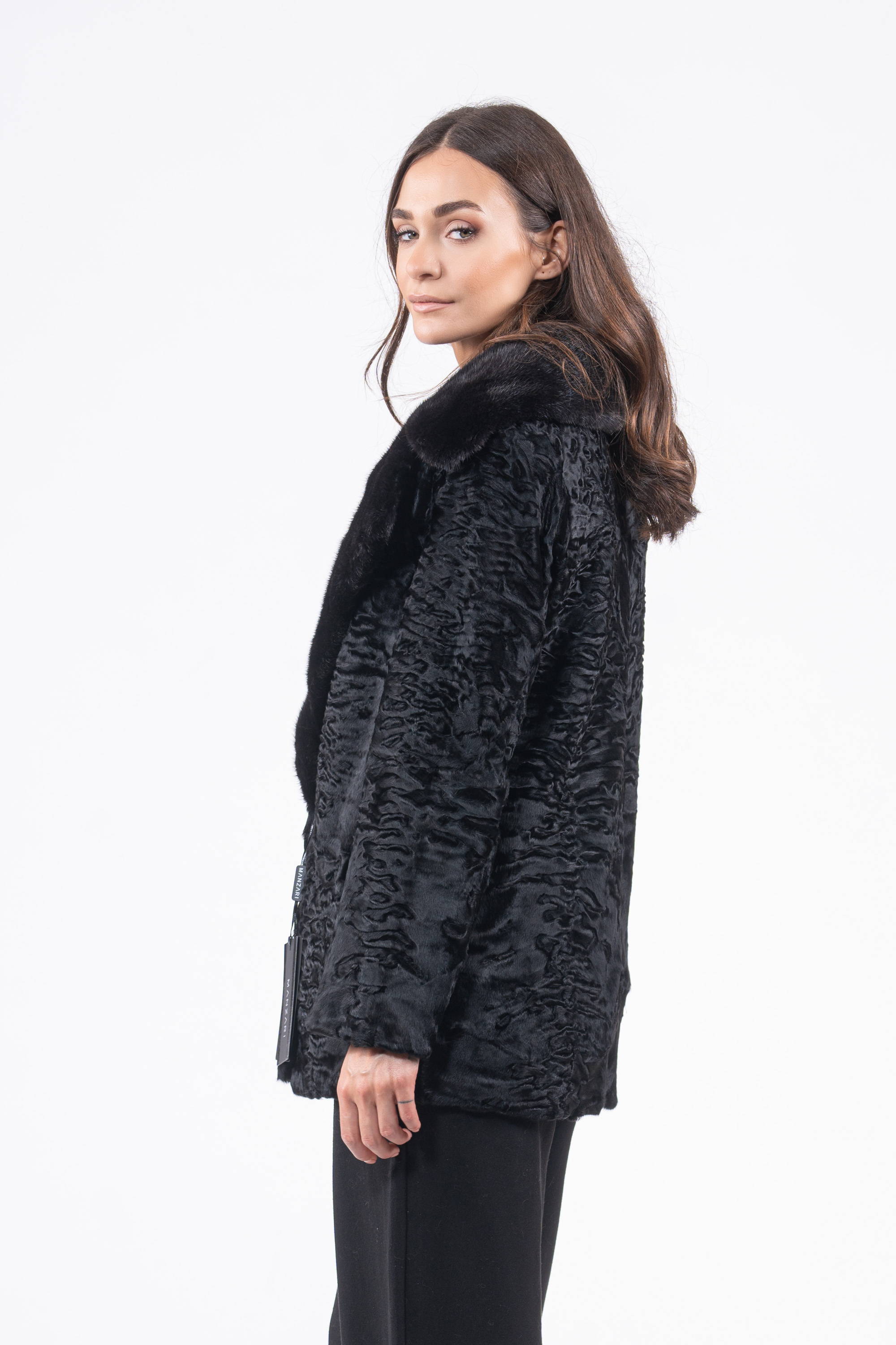Куртка из меха каракульчи с английским воротником из меха не стриженой норки